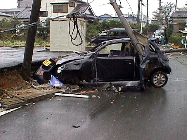 写真09 電柱に衝突し、倒壊した電柱につぶされてしまった車