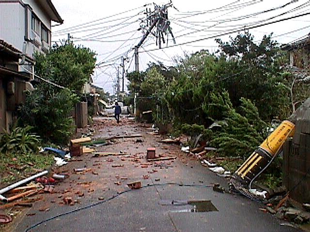 写真22 飛んできた煉瓦で散らかった道路と真ん中で折れてしまった電柱
